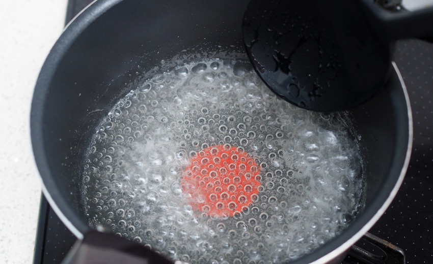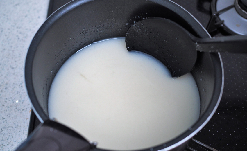 | 手順2 | 鍋に【A】を入れて中火で加熱する。沸騰したら弱火に落とし、粉寒天が完全に溶けるようよく混ぜながらさらに2~3分程加熱する。 |