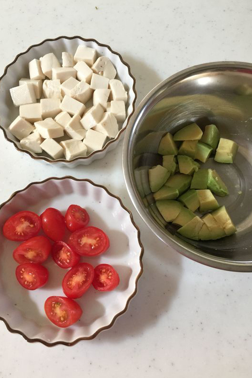 | 手順2 | 豆腐の粗熱が取れて触れるくらいになったらサイコロ状になるように切り、アボカドも1cm角くらい、ミニトマトも半分に切る。 |