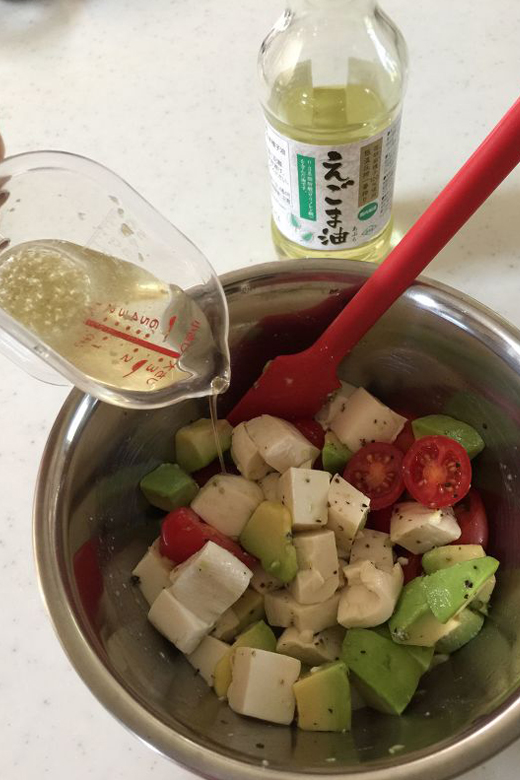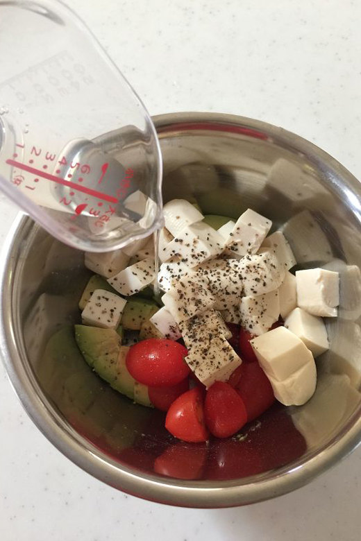 お豆腐の水切り後は冷めるまで少し時間がかかるので、他の食材は(特にアボカドは変色してしまうので)豆腐が冷めてから切るようにしてください。